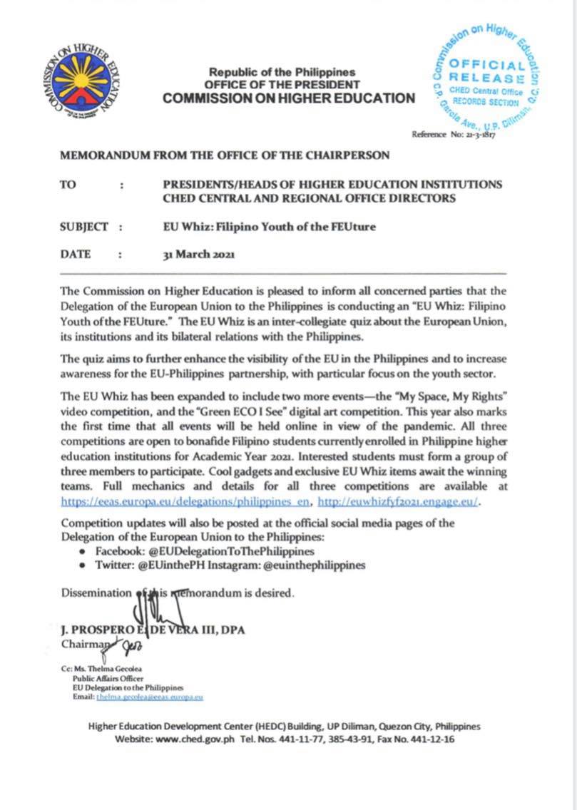 EU-Whiz is divided into three categories; Online Trivia Competition, the Digital Art Competition and the Video Competition. The said competition is open to bonafide Filipino students currently enrolled in Philippine universities for Academic Year 2021. Interested students must form a group of three members to participate. Cool gadgets and exclusive EU Whiz items await the winning teams.